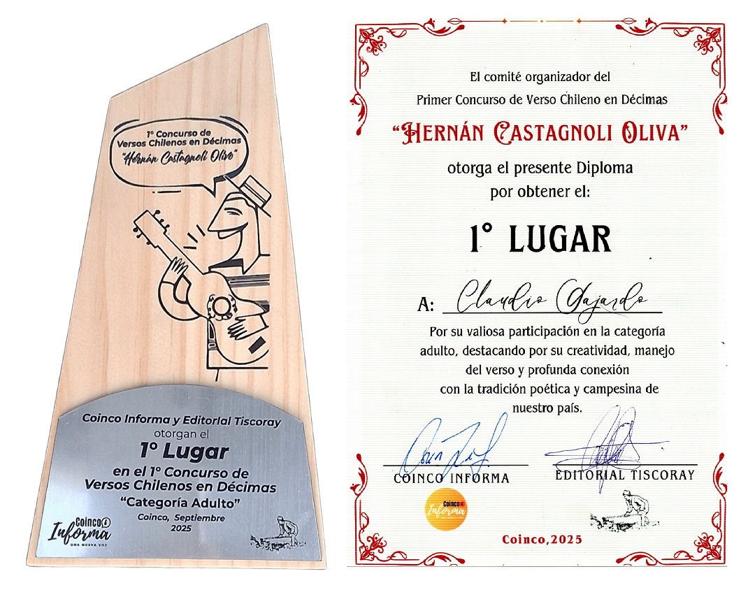 El músico, poeta y escritor santiaguino, Claudio Gajardo, se alzó como ganador en el Concurso de Verso Chileno en Décimas, Hernán Castagnoli Oliva, celebrado en Coinco, Región de O’Higgins. El propio Gajardo, quien escribió su obra, “En mi catre la enamoro”, revela: “Fue emocionante haber ganado este concurso que se realizó, a nivel nacional, y que contó con la participación de muchos poetas decimistas. Mi décima que versa sobre la relación estrecha entre un esposo y su cónyuge está contextualizada en el campo chileno: