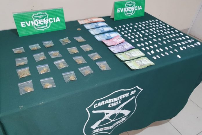 El detenido fue identificado con las iniciales N.C.A. de 16 años y se le incautaron 121 envoltorios de pasta base de cocaína, 29 bolsas de marihuana y $319.500 en efectivo.